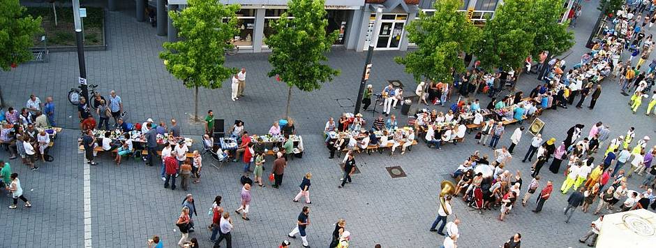 Das Picknick in der Stadt. Für Tische und Stühle wird gesorgt, Essen und Trinken und alles Notwendige für ein Picknick bringen alle nach eigenem Geschmack mit, um gemeinsam genießen zu können.