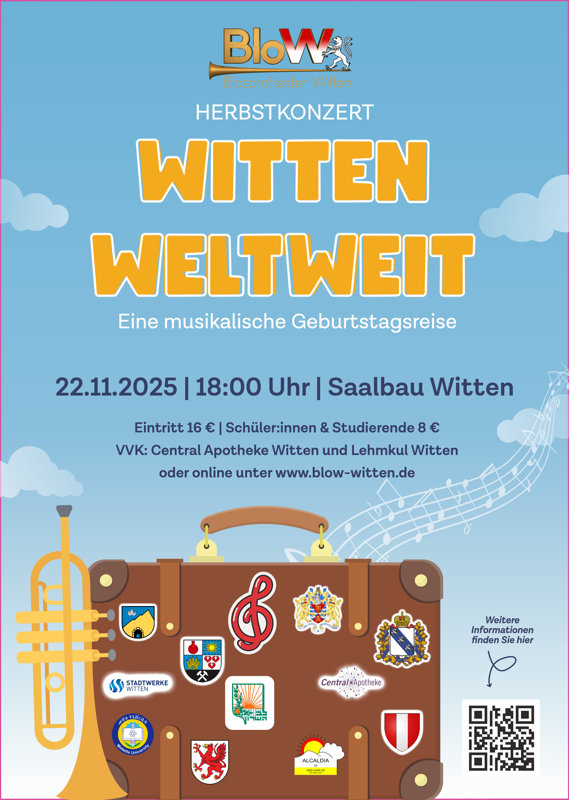 „Feiern Sie mit uns 200 Jahre Witten und kommen Sie mit auf eine musikalische Reise durch alle unsere Partnerstädte. Begleiten Sie uns durch die wundervolle Welt der Musik in unserem Herbstkonzert 2025: Witten Weltweit!“