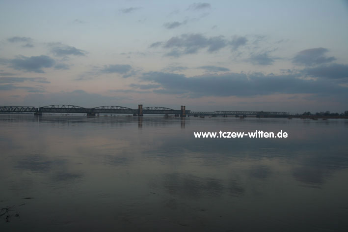 Blick von Süden auf die Weichselbrücken bei Tczew bei Hochwasser. Im Hintergrund die Bögen der